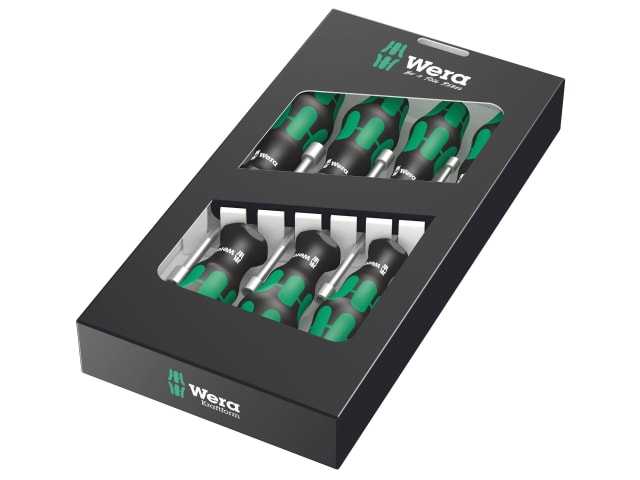 Wera 395 Kraftform Hollow Shaft Nutspinner Set for hexagon headed bolts, screws and nuts. The hollow shaft feature enables the ability to tighten or loosen seized screws or nuts on long threads.