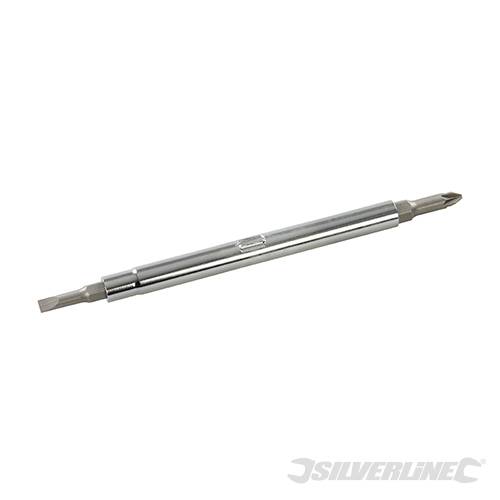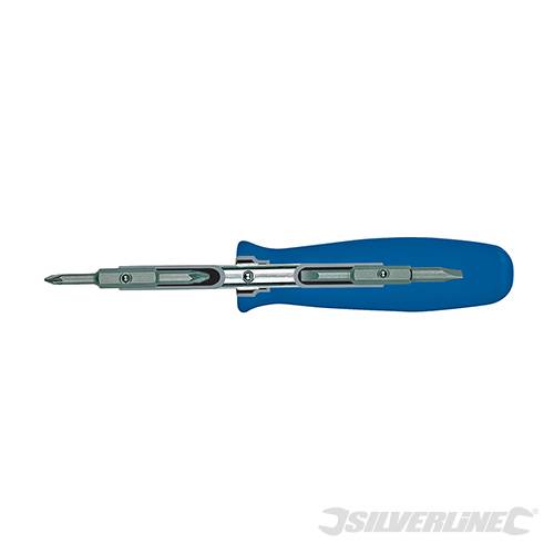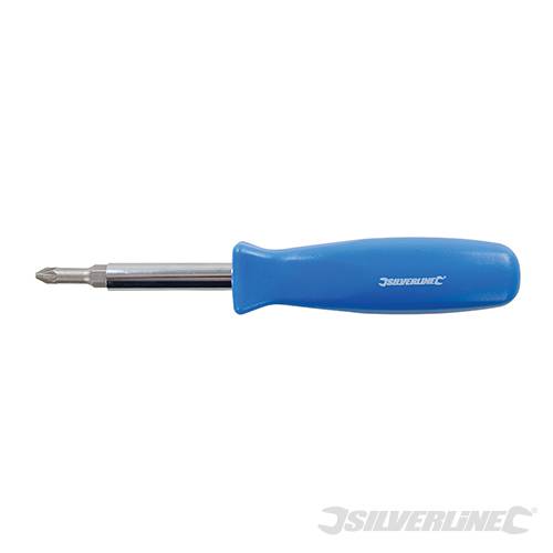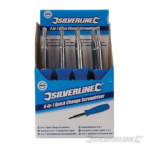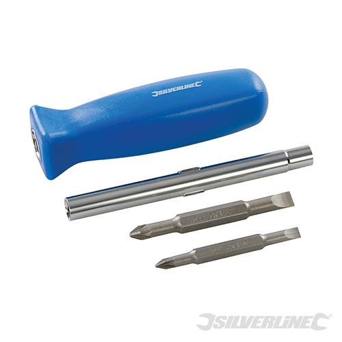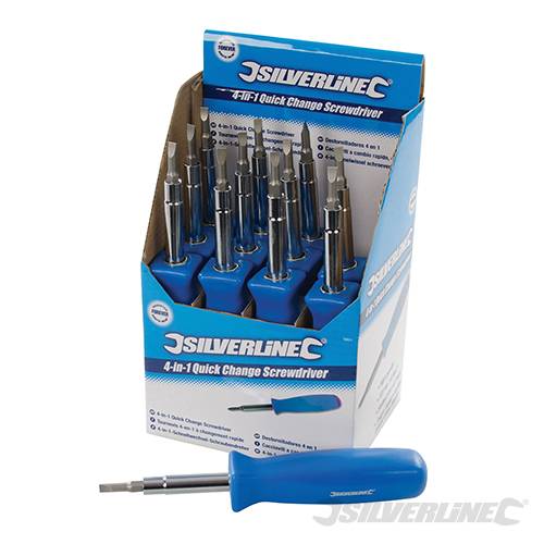 4-in-1 quick-change screwdrivers. Tough impact-resistant polymer driver handle. Quick-change screwdrivers with 4 end bits. Includes slotted: 5mm, 7mm; Pozidriv: PZ1, PZ2.
