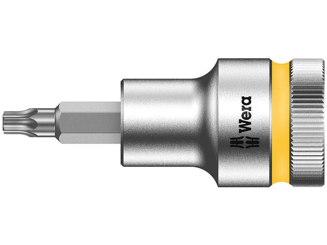 The Wera 8767 C TORX HF Zyklop Sockets with a holding function that securely holds TORX fasteners. Assembly or disassembly becomes easy where fasteners are recessed, in awkward spaces or where overhead work is necessary. Sockets are guaranteed for production use with non-impact power tools.