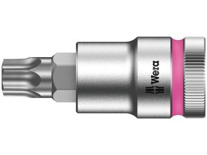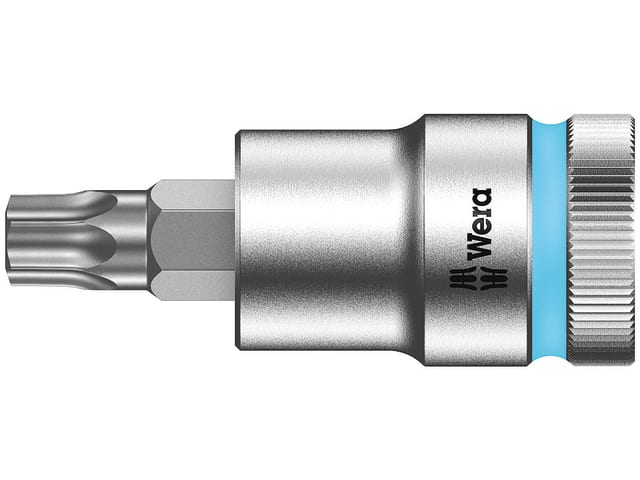 The Wera 8767 C TORX HF Zyklop Sockets with a holding function that securely holds TORX fasteners. Assembly or disassembly becomes easy where fasteners are recessed, in awkward spaces or where overhead work is necessary. Sockets are guaranteed for production use with non-impact power tools.