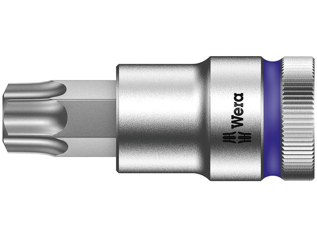 The Wera 8767 C TORX HF Zyklop Sockets with a holding function that securely holds TORX fasteners. Assembly or disassembly becomes easy where fasteners are recessed, in awkward spaces or where overhead work is necessary. Sockets are guaranteed for production use with non-impact power tools.