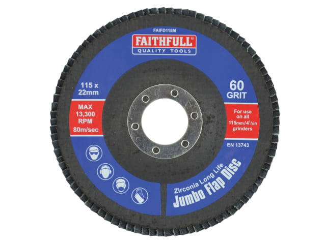 Faithfull Abrasive Jumbo Flap Discs contain up to 40% more abrasive than standard flap discs, providing a considerably longer working life. Manufactured from long lasting Zirconia Alumina. Resin bonded for extra strength and durability.
