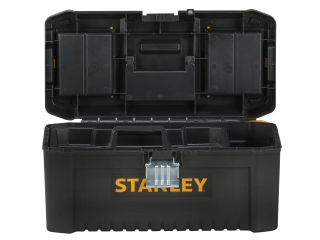 The Stanley Tool Basic Toolbox has an innovative design with an organiser lid for small parts storage. It is fitted with geometric lock latches that enable smooth closing and opening. The latches are made from metal and have an ergonomic design. The toolbox can be secured with a padlock (not supplied) for increased security.