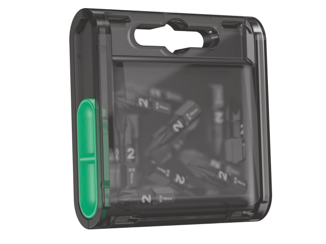 Incorporates Wera’s tool finder system, based on coloured band coding for screw profiles (black = Pozidriv; red = Phillips etc.) with clear size markings. The Bit-Box slide switch allows simple and gradual removal and reinsertion of the bits. The transparent reverse side provides an easy contents check.