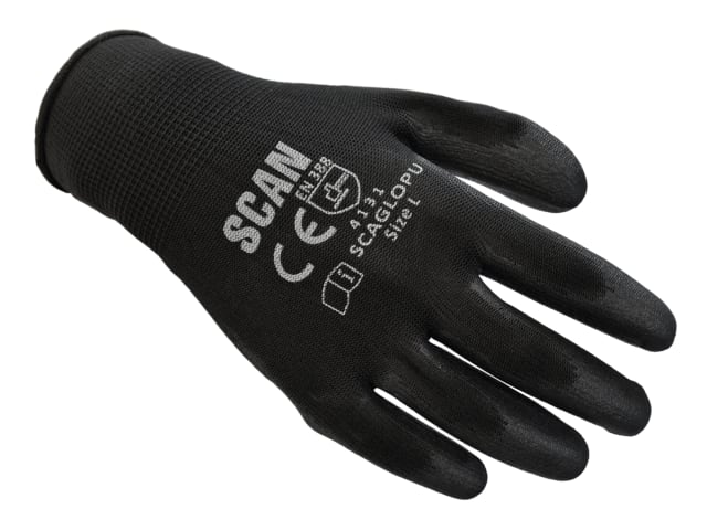 These Scan Black PU Coated Gloves are made from knitted nylon with a seamless finish and a fine polyurethane coating over the palm and fingers. The back of the glove is uncoated to provide ventilation to the hand, avoiding perspiration and clamminess. These gloves are suited to work where a high level of dexterity is needed along with a good protection factor.