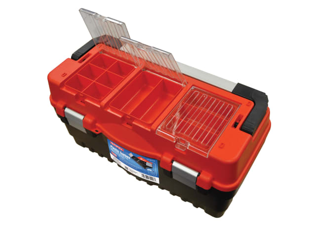 The Faithfull Plastic Toolbox is highly versatile with a selection of storage options for hand tools and smaller items. With a removable cantilever tote tray organiser with bit storage. Additional storage is provided by three integral organiser compartments built into the lid, with impact resistant transparent polycarbonate lids to enable easy identification of the contents.