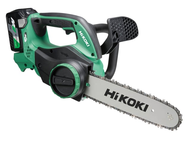 The HiKOKI CS3630DA Cordless Top Handle Chainsaw is fitted with a powerful brushless motor for extended run time. It has a lightweight, compact design with soft grip handles. The secondary handle provides increased control. The oil tank features a back light making it easy to check the oil level. The chain can be tensioned and changed without tools. Fitted with a mechanical kick-back brake for added safety, and a storage hook.