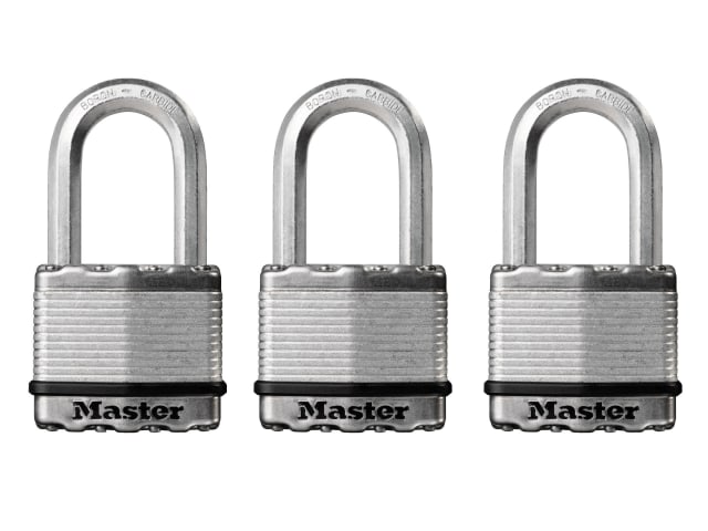 3 x 50mm Excell™ laminated steel padlocks – 38mm Octagonal boron carbide long shackle, 9mm diameter – 4-pin tumbler cylinder – dual ball bearing locking – keyed alike