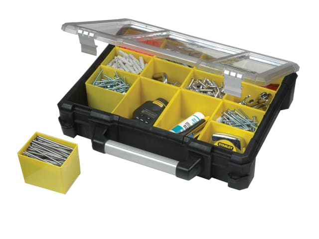 The Stanley FatMax® Extra Large Professional Organiser with a transparent polycarbonate lid that locks compartments in position for easy access. It has 14 removable storage cups for easy access and extra large storage capacity for small parts and accessories.