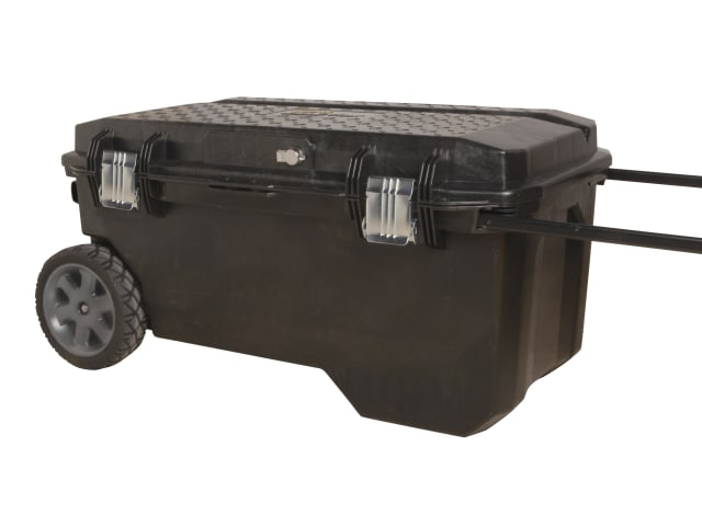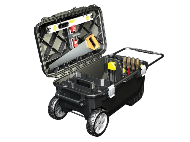 The Stanley FatMax® Mobile Chest has a lock mechanism in the lid to hold a level and a saw. Tools can also be stored vertically within the chest. An all-round water seal keeps valuable contents safe. Heavy-duty wheels give mobility on rough surfaces.