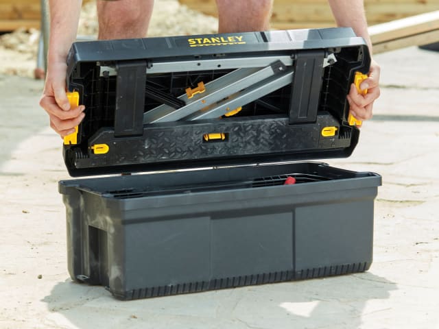 The Stanley Tools FatMax® Work Step Toolbox combines a toolbox and work step in one. It has a lightweight design with an ergonomic carry handle for easy carrying. The work step has stainless aluminium legs with non-slip feet to ensure optimum stability and longevity. For added safety the step has been fitted with safety lock buttons.