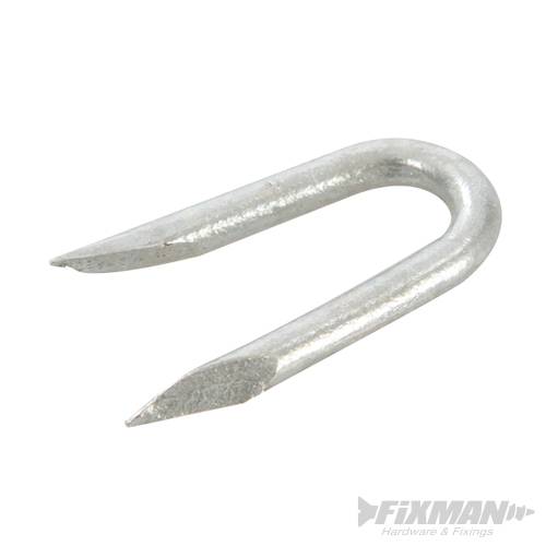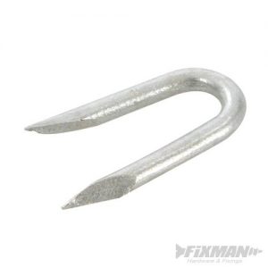 Made from rust-resistant galvanised steel. U-shaped for superior hold and featuring sharp, tapered ends for the effective securing of wire lengths. Approximately 945 staples per ½ kg.