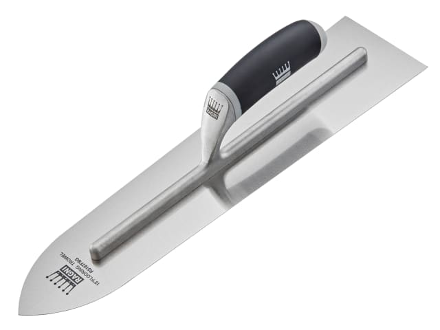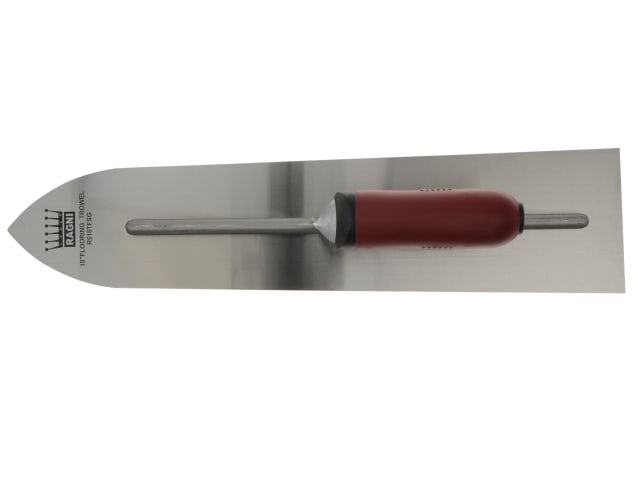 Ragni Flooring trowel with soft grip handle. Used for applying mortar or cement on the floor. The pointed nose is for easy access into corners.