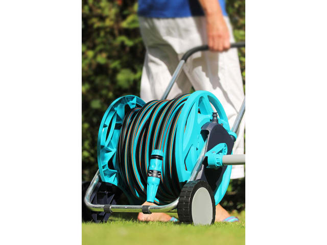The Flopro + Hose Cart has a rust resistant aluminium frame with a comfort grip handle and reinforced wheels. It is designed to ensure that the hose does not twist or kink when winding.
