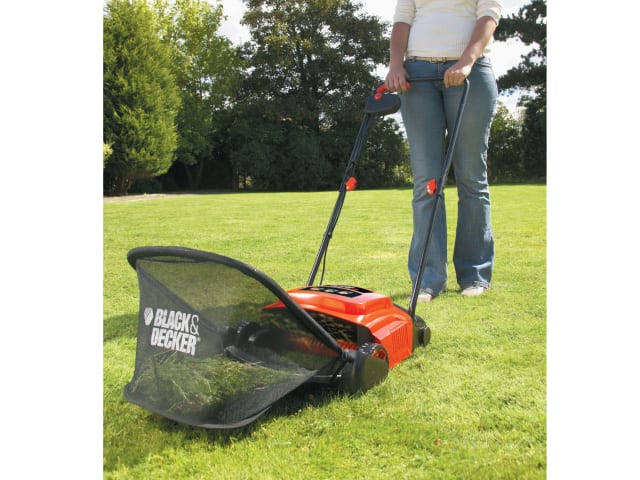 The Black & Decker GD300 Lawnraker is suitable for medium gardens and has a 30cm raking width with a rear roller and 3 raking heights for year round maintenance. The raking mechanism has metal tines. A large capacity, front loading grass box provides easy collection and disposal of debris. Central height adjustment system for speed and ease of use.