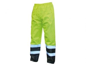 Scan High-Visibility Orange Waterproof Motorway Trousers with taped seams and retro-reflective tape. They have a fully elasticated waistband and are 100% polyester with PVC coating. Offers excellent protection against adverse weather conditions.