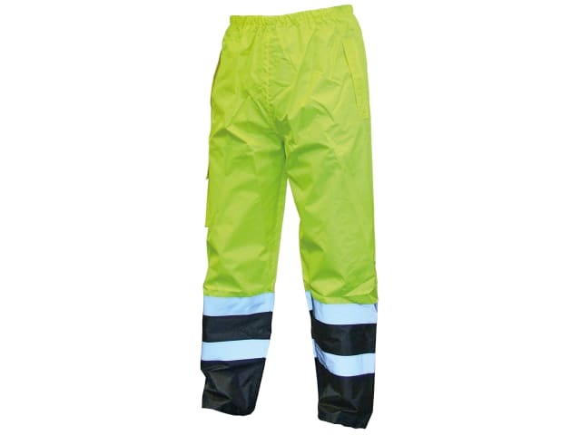 Scan High-Visibility Yellow Trousers made from 100% polyester with a polyurethane coating for protection against foul weather. Waterproof seams, stitched and taped. Elasticated waist and retro-reflecting tape. Offers excellent protection against adverse weather conditions.