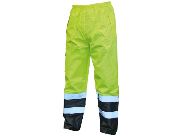 Scan High-Visibility Yellow Trousers made from 100% polyester with a polyurethane coating for protection against foul weather. Waterproof seams, stitched and taped. Elasticated waist and retro-reflecting tape. Offers excellent protection against adverse weather conditions.