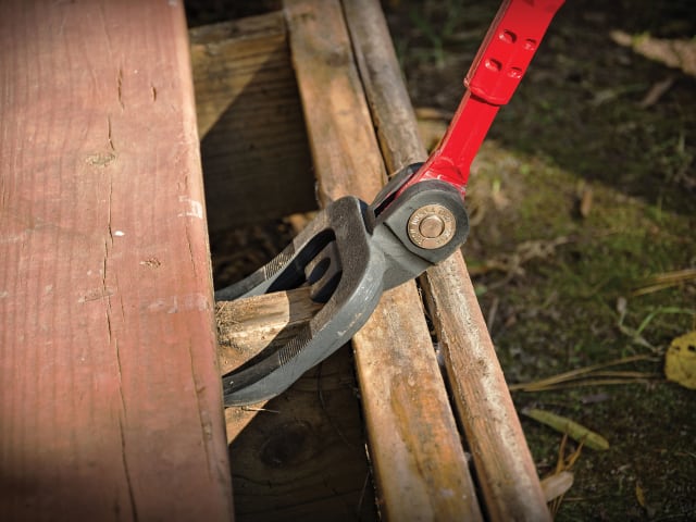 The Crescent Indexing Decking Removal Tool has a double fork design that provides a balanced lift on both sides of the nail. The precision tips provide fast access between boards, reducing damage for reclaiming materials. The gripping teeth on forks assist in preventing board slippage. Fitted with an indexing joint that allows for maximum flexibility and increased leverage.