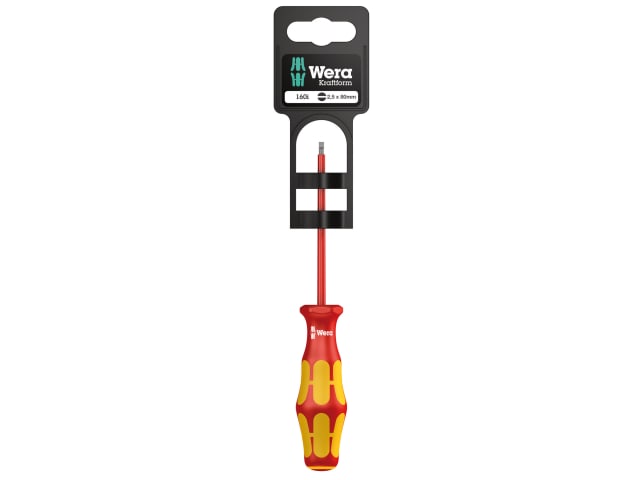 The Wera Slotted 160i VDE insulated screwdrivers are tested individually for dielectric strength under a load of 10,000 volts so as to ensure safe working with loads up to 1,000 volts. They have a premium lasertip which is a laser roughened surface that literally bites into the screwhead, reducing cam out. With patented ergonomic, multi component Kraftform handle which uniquely fits to the shape of the hand during screwdriver use.