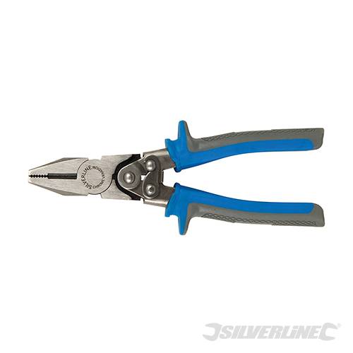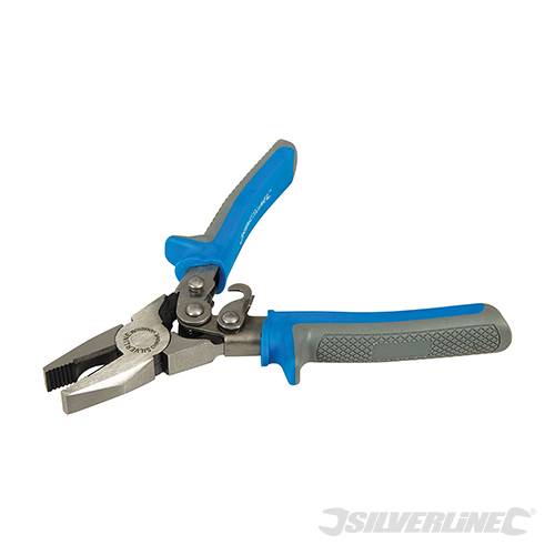Chrome vanadium steel cutting pliers with parallel gripping and cutting jaws. Co-moulded grips for comfort. Compound action increases cutting pressure by 50%. Locking bracket for storage.