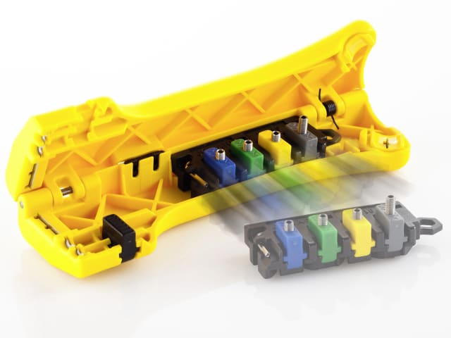 The depth stops are colour coded for easy identification and matching to cables. A hex key is supplied for adjustment. The kit neatly stores in the handle of the cable stripper.