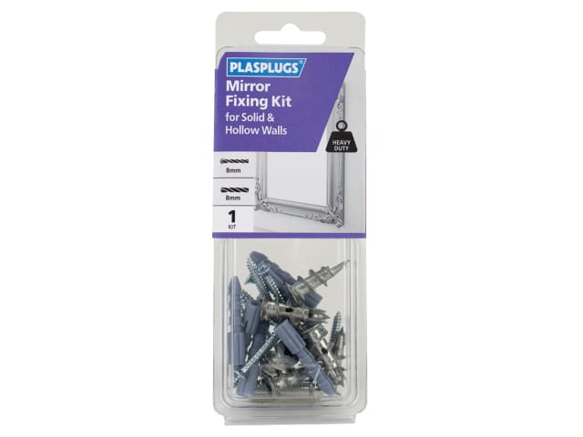 The Plasplugs® Mirror Fixing Kit contains all the relevant fixings for correct mirror installation on solid and hollow walls. Requires an 8mm drill bit: for hollow walls use an HSS drill bit; for solid walls use a masonry drill bit.