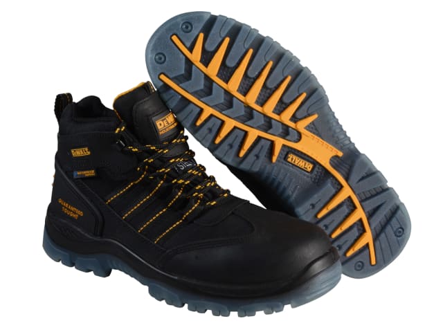 The DEWALT Nickel S3 Black Safety Boots have a full grain leather and canvas uppers. With a waterproof and breathable Samsung membrane inner lining and PU comfort insoles for dry, comfortable all day wear. The padded tongue and collar provide increased comfort.