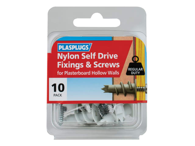 Plasplugs® Nylon Self Drive Fixings & Screws drill and fix in one. Fast, effective fixings for use in plasterboard hollow walls. Typical applications: sockets, electrical fittings, light switches, brackets etc.