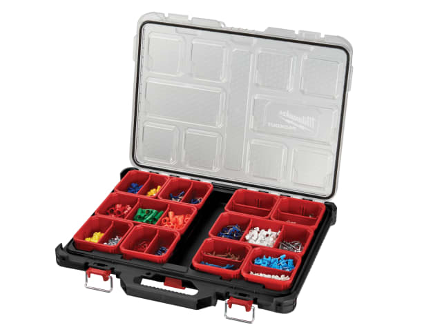 The Milwaukee Hand Tools PACKOUT™ Slim Organiser is constructed from impact-resistant polymers for jobsite durability. The lid features an IP65 rated weather seal to keep out rain and jobsite debris. The interior features 10 removable bins (2 large and 8 small bins) that can be mounted onto hooks, nails etc. for easy access. The ‘no-travel’ bins, seal to prevent the contents from migrating between bins during transport.