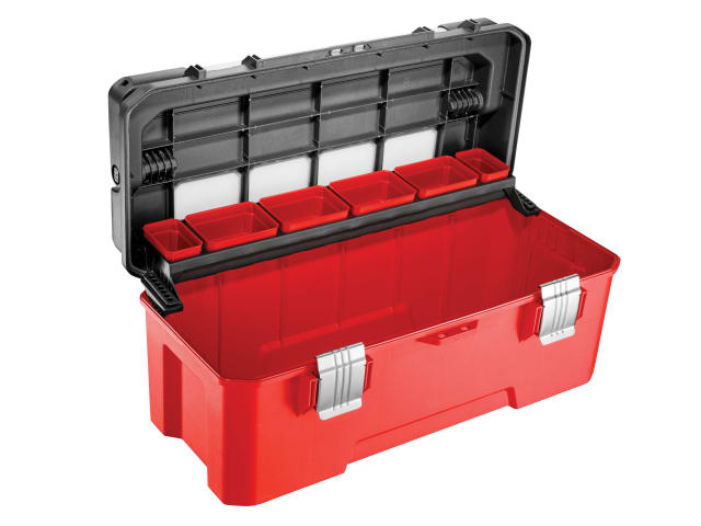Inside there is a large compartment with a universal sliding tray and removable containers, suitable for hand tools and accessories. The lid has transparent windows that allow you to see the contents of these containers. It also features a padlock eye, enabling you to lock the box if required (padlock sold separately).
