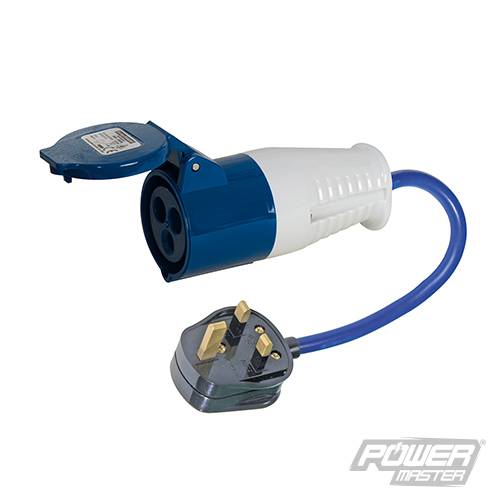 13A BS plug to 16A 3-pin 2P+E socket converter suitable for camping, caravanning and on-site generators