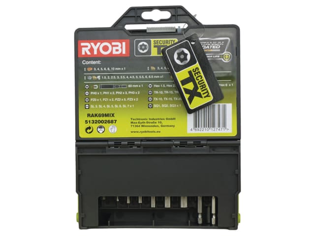 The Ryobi RAK 69MIX 69 piece mixed screwdriver set contains the most popular sizes and is supplied in a case. Contains: