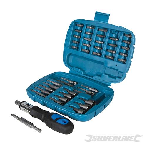 Includes 25mm bits: slotted 1 x 5mm, 3 x 6mm, 1 x 7mm; Phillips 1 x PH1, 5 x PH2, 1 x PH3; Pozidriv: 1 x PZ1, 2 x PZ2, 1 x PZ3; Trx: 1 x T10, 2 x T15, 1 x T20; Security: 1 x 1, 2 x 3, 1 x 3