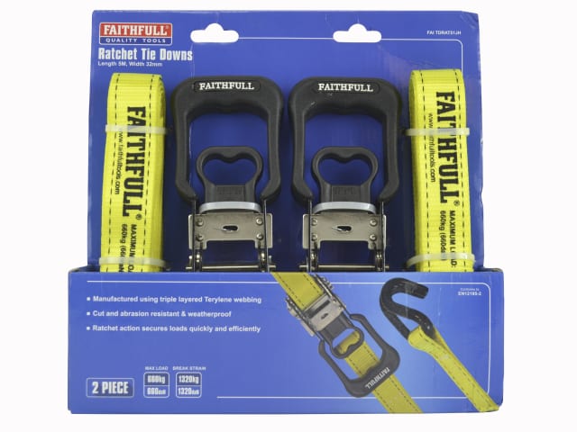 This Faithfull Ratchet Tie-Down is manufactured from a 32mm wide triple layer Terylene webbing which is weatherproof, cut and abrasion resistant. The ratchet and J style hooks ensures that loads are secured quickly and efficiently and provide ease of use. The tie downs meet the following specifications: