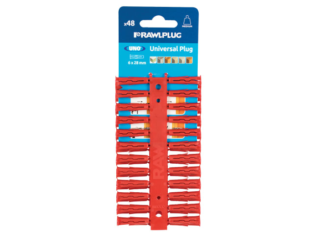 Rawlplug® UNO® Plugs are truly universal plugs which fix into any wall, ceiling or floor. Suitable for use in: concrete, brickwork, stone, blockwork, plasterboard. They have a unique design with expansion throughout the length of the plug. They expand at the top giving instant grip. Anti-rotation features prevent spinning in the hole.