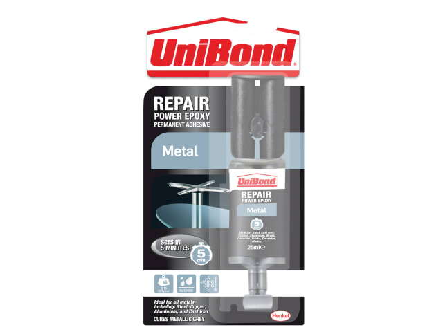 Unibond Repair Metal is a reactive, fast setting 2-component, non-shrinking, non-expanding epoxy based adhesive supplied as a twin chamber syringe.