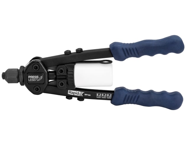 The Rapid RP100 Heavy-Duty Press Less Hand Riveter has a built-in power reduction mechanism to reduce the effort needed. It is ideal for use on tough materials such as metal. The power reduction mechanism and long arms substantially reduce the force needed to fix the rivet, allowing the tool to be used for long lengths of time without fatigue.