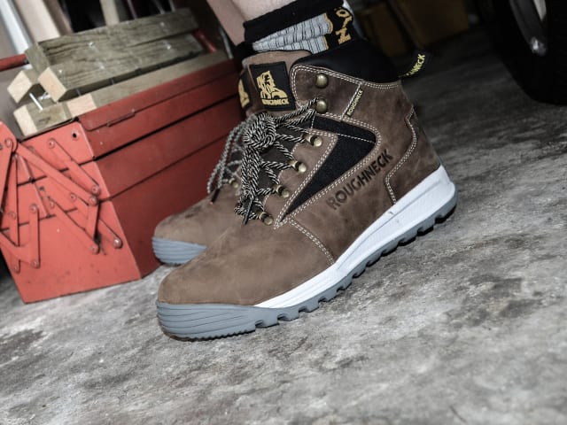 The Roughneck Sabre Work Boots are made from full grain leather, with a distressed leather effect finish. The boots have steel toecaps, tested to 200 Joules, and composite midsoles. A composite midsole has the same protection as a steel midsole, but with greatly improved flexibility and comfort. This helps to reduce fatigue and increase comfort in everyday use. The boots have dual density soles that are resistant to oil, chemicals and temperatures of up to 300°C whilst offering shock absorption.