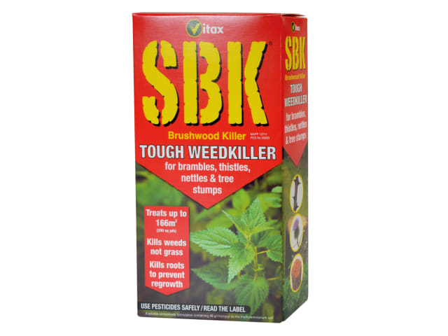Vitax SBK Brushwood Killer is a selective weedkiller for brambles, nettles, dock, woody weeds, hardwood saplings and tree stumps in grass and other neglected non-crop areas. It does not kill grass.