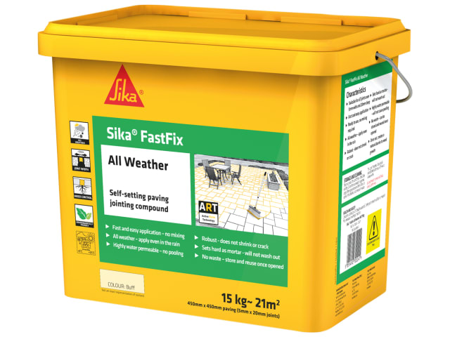Sika® FastFix All Weather is a self-setting paving jointing compound that provides perfect pointing on paving, paths and patios. It has a unique formula that contains Active Resin Technology for advanced durability. It is ready to use with no mixing required, easy to apply in all weather conditions (even in the rain) and won’t shrink or crack over time.