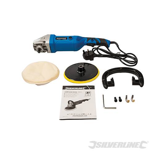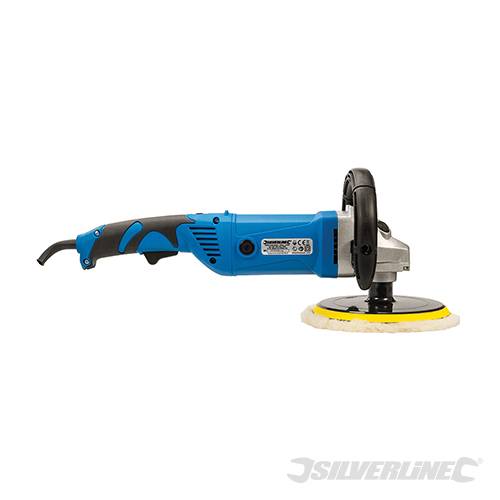 Mains-powered 1500W polisher with 180mm hook and loop backing pad for efficient accessory installation