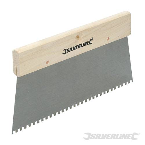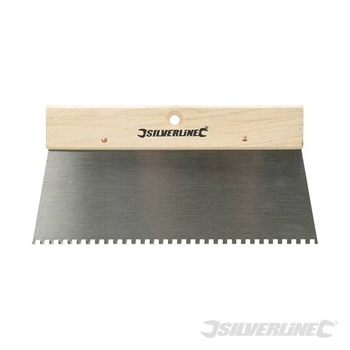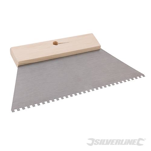 Flexible, polished high-carbon steel blade with a smooth, comfortable wooden handle. Handy hanging hole for storage. Allows rapid and even spreading of adhesives for tiling, flooring, cladding and carpet-laying applications.