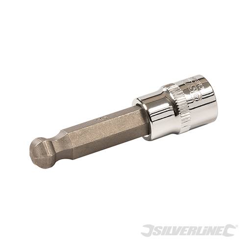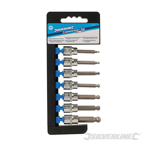 Hardened and tempered ball-end hex bits with satin finish, mounted in polished chrome vanadium square drive sockets