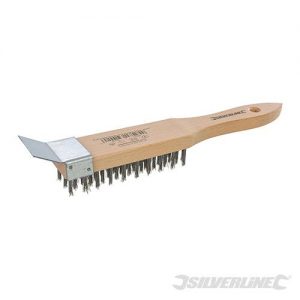 Quality brush with wooden handle and steel bristles for removing rust and scale, and for general surface preparation. Hanging hole for storage. 6-row model includes scraper.