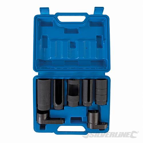 Includes 3/8″ 22 x 30mm offset oxygen sensor socket; 3/8″ 27 x 74mm oil sender unit socket; 3/8″ 22 x 80mm narrow slot vacuum sensor socket; 3/8″ 22 x 90mm wide slot oxygen sensor socket; 1/2″ 22 x 50mm offset heated oxygen sensor socket; 1/2″ 27 x 85mm injector socket, and 1/2″ 29 x 90mm oxygen sensor socket, in a tough storage case