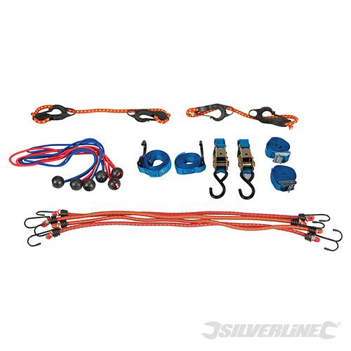 Includes bungee cords, cam buckle straps and S-hook ratchet tie-down straps