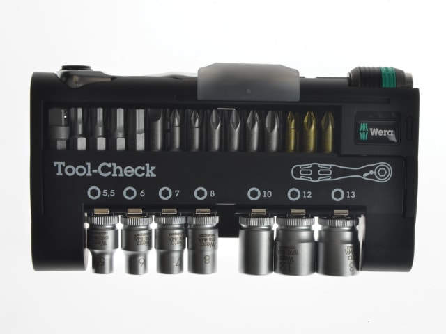 The Wera 39 Piece Bit Check 1 SB Ratchet/Socket Set is a compact, portable hard-case kit featuring the deceptively powerful Wera Bit Ratchet, a huge selection of 25mm bits and range of Zyklop sockets. The bit Ratchet was specially designed for use in confined spaces and can easily fit into a pocket or toolkit. It features two-direction ultra-fine ratchet action with 60 teeth for rapid fastening. Made from drop-forged steel with torque exceeding 65Nm, this robust ratchet has a handy thumbwheel for accelerated fastening in the tightest of spaces.