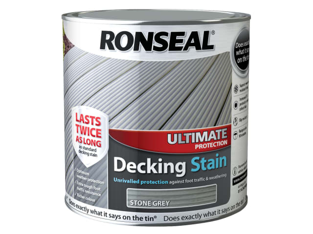 Ronseal Ultimate Protection Decking Stain provides superior, natural looking protection, for a longer lasting finish. The unique formula penetrates deeper into the wood to provide increased durability. Providing a lightly tinted finish it will give double the weather resistance and foot traffic protection, versus standard decking oils. Unique, water based Linseed Oil technology colours and waterproofs decking in one easy step.