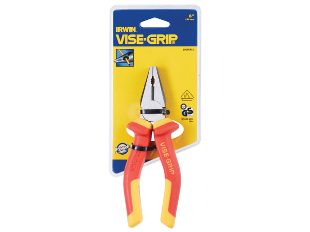 IRWIN Vise-Grip VDE Combination Pliers manufactured from chrome nickel steel. With strong gripper teeth and a slim profile nose that reaches into tight areas. The teeth are hardened for increased durability. Fitted with VDE ProTouch™ handles for maximum comfort and reduced hand fatigue.